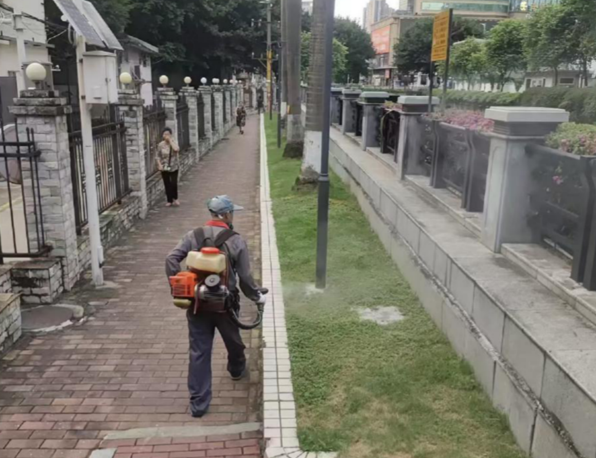 与此同时,消杀队采用“车载喷雾+人工补位”的组合模式:车载喷雾设备凭借覆盖范围广、作业效率高的优势,快速完成开阔区域消杀;人工补位则聚焦墙角缝隙、绿化带根部等机械作业难以触及的“盲区”,确保消杀工作无死角。
