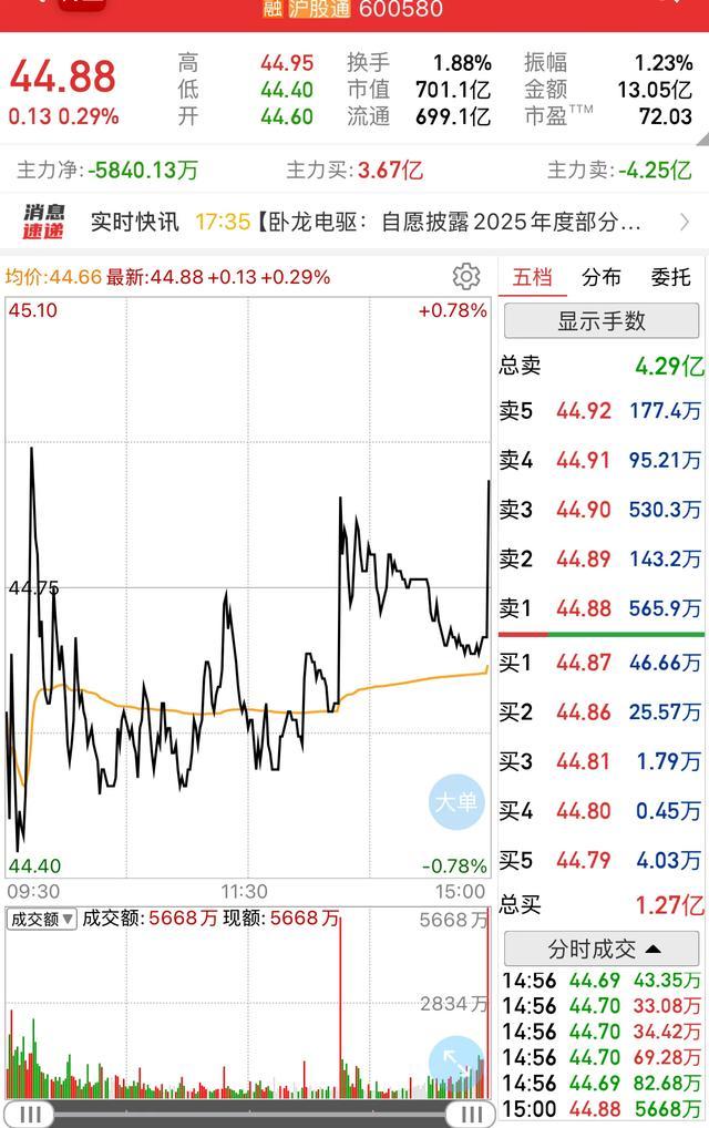 2026年2月27日,卧龙电驱(600580)以44.60元开盘,开盘后快速下探至当日最低点44.40元,随后在资金微弱承接下展开窄幅震荡,早盘多次试探44.80元关口。午后,受电机电控板块小幅走强与机器人概念分化影响,股价短暂冲高至当日最高价44.95元,随后再度回落,最终以44.88元收盘,当日涨幅0.29%,上涨0.13元,收于日内震荡区间上沿。