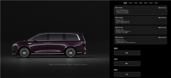 智界V9定位大型MPV,长宽高为5359*2009*1859/1879mm,轴距为3250mm,提供深海蓝、雪域白、鎏金黑和辉光紫四种配色。