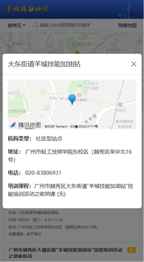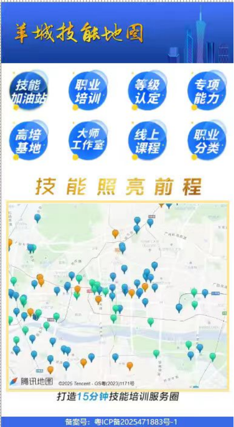为实现培训站点与课程信息的“一键查询”,广州坚持便民高效原则,应用信息化手段创新建立了清晰、科学、合理的“羊城技能地图”查询平台。市民可通过扫描“羊城技能地图”二维码,一键查询以所处位置为圆心的15分钟活动半径内的“羊城技能加油站”,精准选择去哪里培训,去哪里考证。