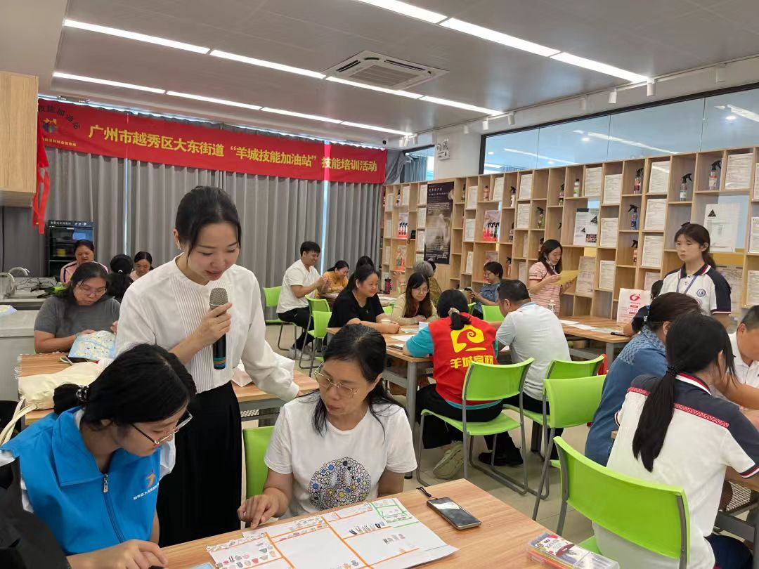 在荔湾区,以永庆坊为核心的技能培训辐射区已初具规模,区域内多宝街“非遗传承”、东沙街“中医药传承”、中南街“花卉培育”、海龙街“增材制造”等多个特色培训示范点已开展培训活动。永庆坊站点站长谭景瑜介绍,站点自3月揭牌以来已开展10场培训,培训160人,最受欢迎的是“三雕一彩一绣”等非遗课程。如辖区居民陈女士参加了广绣技艺培训和创业课程,不仅用所学技艺成功创作西关小姐口金包等作品,还在创业导师指导下参加集市、在广东胜利宾馆大堂举办个人作品展,实现技能就业、技能增收。